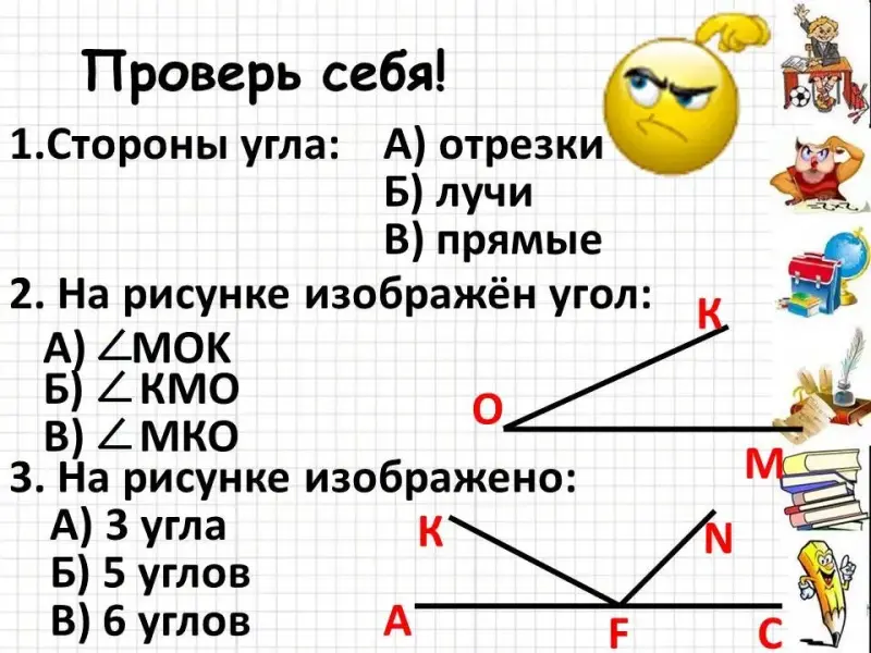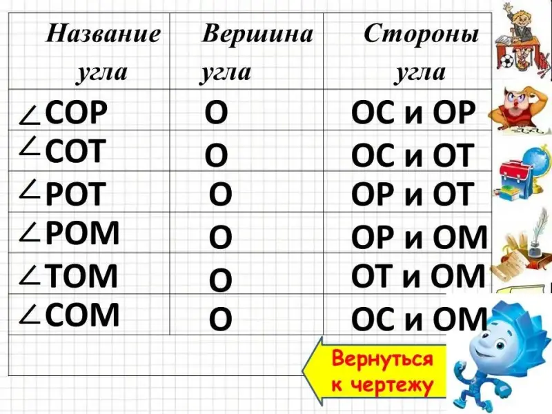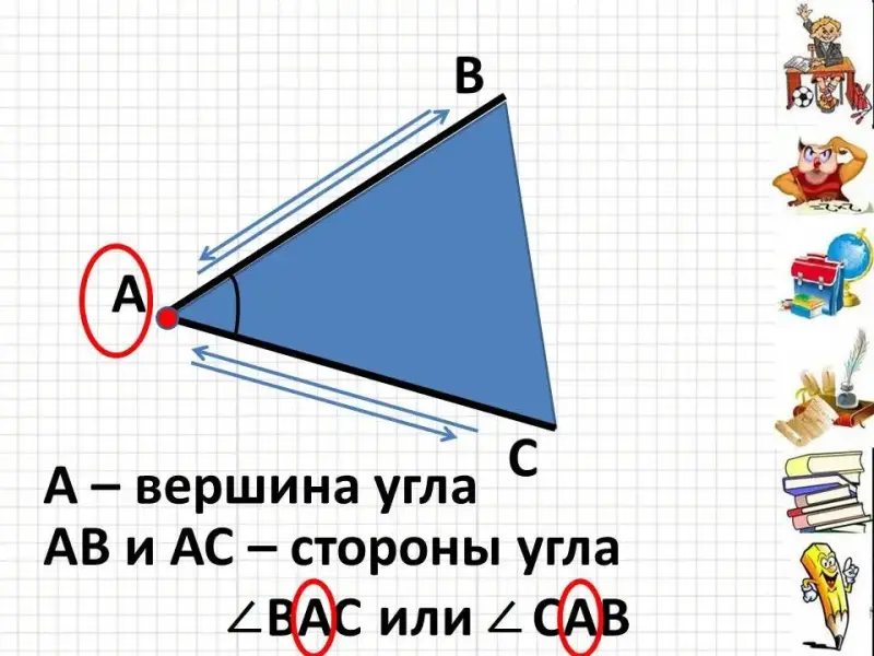 - Назовите углы, их вершину и стороны.