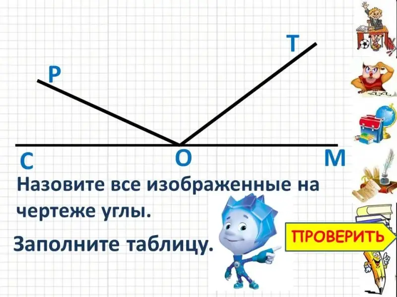 СЛАЙД 10 Назовите все углы, изображённые на рисунке и заполните таблицу. (СЛАЙД 11. Заполнение таблицы - проверка)