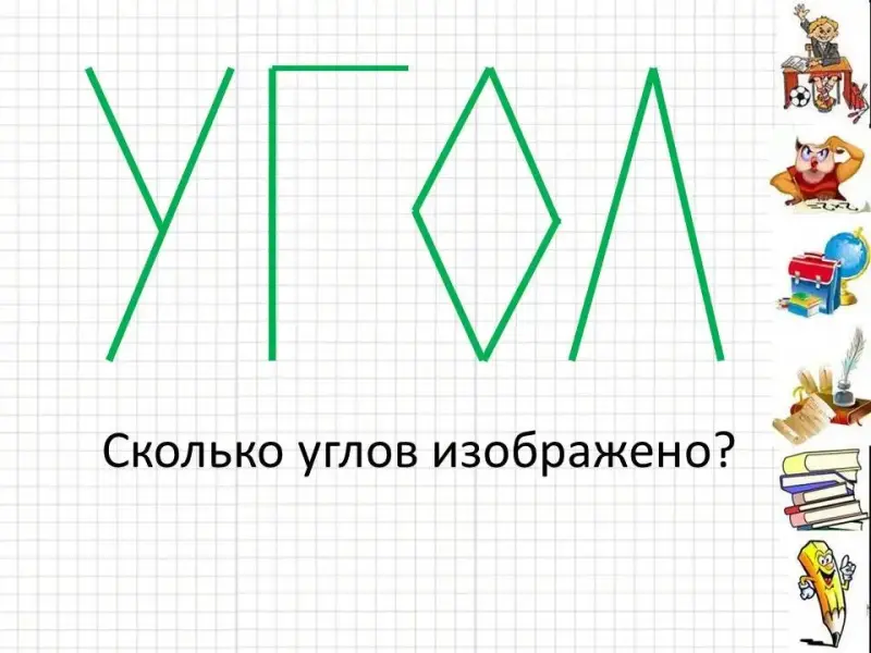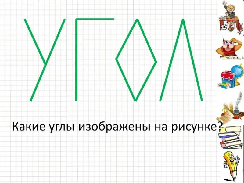 При появлении картинок один из учеников выходит и показывает углы на изображённом предмете.
