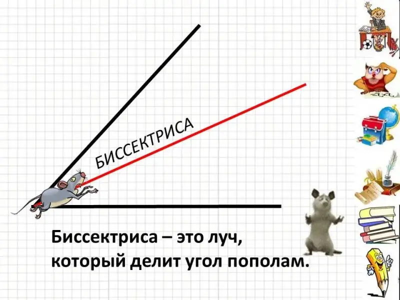 Цель: познакомить с понятием «биссектриса угла»; ввести классификацию углов через сравнение с прямым углом.