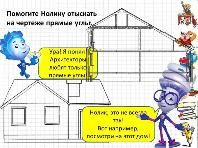 СЛАЙД 20. Помогите Нолику в отыскании прямых углов у домика.