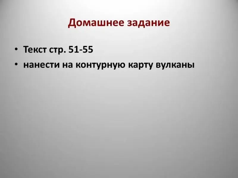 Домашнее задание. Текст стр. 51-55, на к/к нанести оставшиеся вулканы.