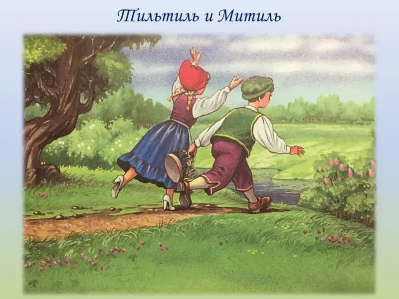 В сказке Метерлинка "Синяя птица" говорится о мальчике Тильтиле и его сестренке Митиль, которые вместе с Душами предметов по просьбе феи отправляются на поиски Синей птицы - счастья. Они побывали во