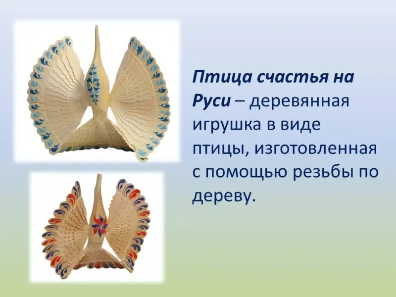 Птица счастья на Руси - деревянная игрушка в виде птицы, изготовленная с помощью резьбы по дереву. Птицу подвешивали под потолком в переднем, «красном» углу деревенской горницы, где располагался стол с лавками. Когда на него ставили кипящий самовар, резная птица, повинуясь токам горячего воздуха, медленно и торжественно вращалась вокруг оси. Птица счастья вешалась в доме в качестве оберега, хранителя домашнего очага и благополучия.