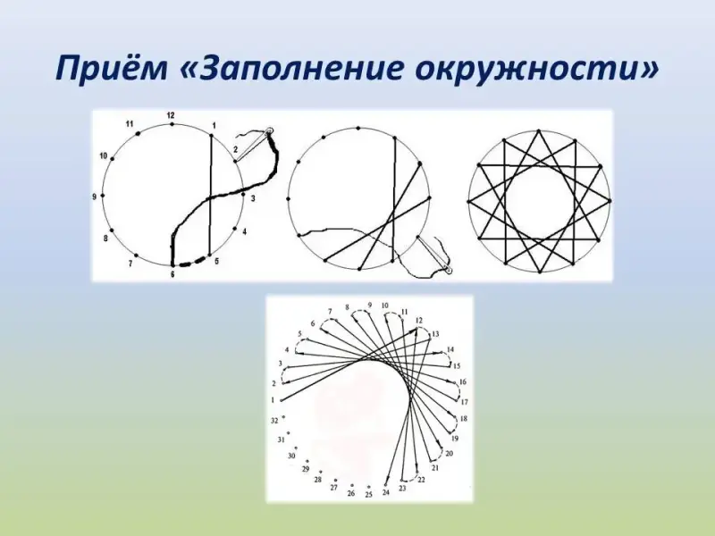 Теперь начнём работу над окружностью с хордой равной 5 отверстиям. (Хорда - это линия между двумя точками). Введём с изнанки илу в отверстие №1 и направим в отверстие №5 (запомним число отверстий