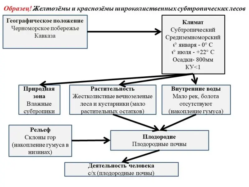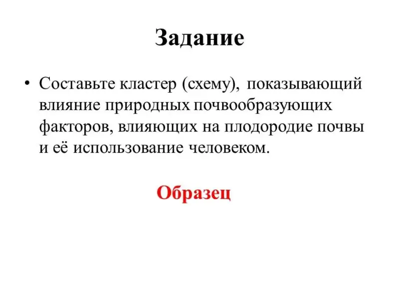 Составьте кластер (схему), показывающий влияние природных почвообразующих факторов, влияющих на плодородие почвы и её использование человеком по образцу.