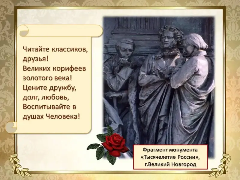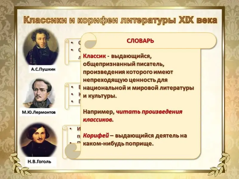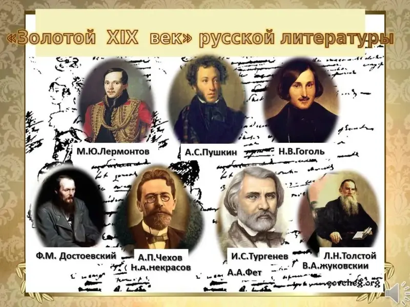 Учитель: В развитии литературы разных стран существуют эпохи, отмеченные необычайно мощным расцветом ее талантов. Для подобных периодов было придумано даже особое обозначение - «золотой век». Есть свой «золотой век» и в русской литературе. Им по праву называется XIX столетие, породившее созвездие блестящих мастеров слова: А.С. Пушкина, М.Ю. Лермонтова, Н.В. Гоголя, Ф.И. Тютчева, Н.А. Некрасова, И.С. Тургенева, Н.С. Лескова, И.А. Гончарова, Л.Н. Толстого, Ф.М. Достоевского, А.П. Чехова и др. Их художественное наследие является достоянием не только русской, но и мировой литературы. Имена трёх из них знакомы нам с детства. Их заслуги перед литературой и народом огромны.