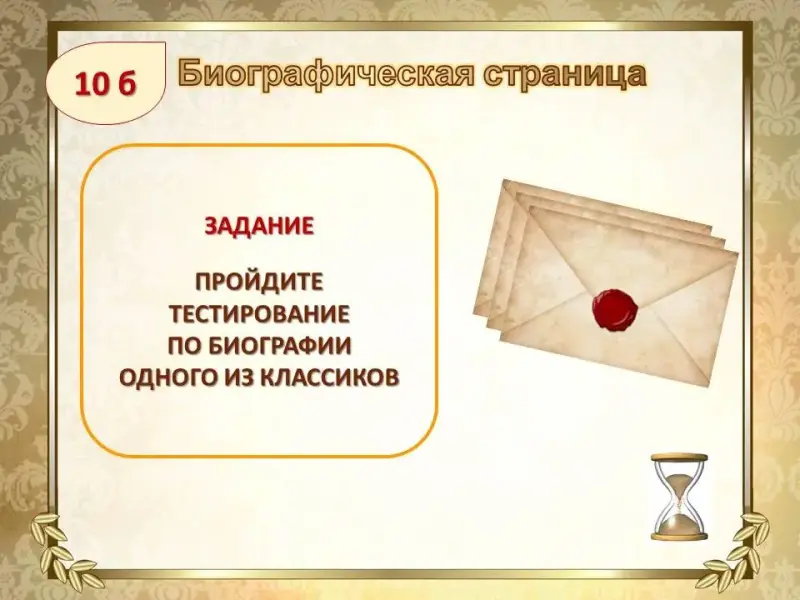 Задание-тест по биографии (10 баллов). Каждая команда выбирает конверт, в котором тест по биографии одного из классиков. За три минуты выполняет задания и отдаёт жюри. (3 мин.) Проверка жюри. Правильные ответы раздаются командам. Приложение 3, Приложение 4.