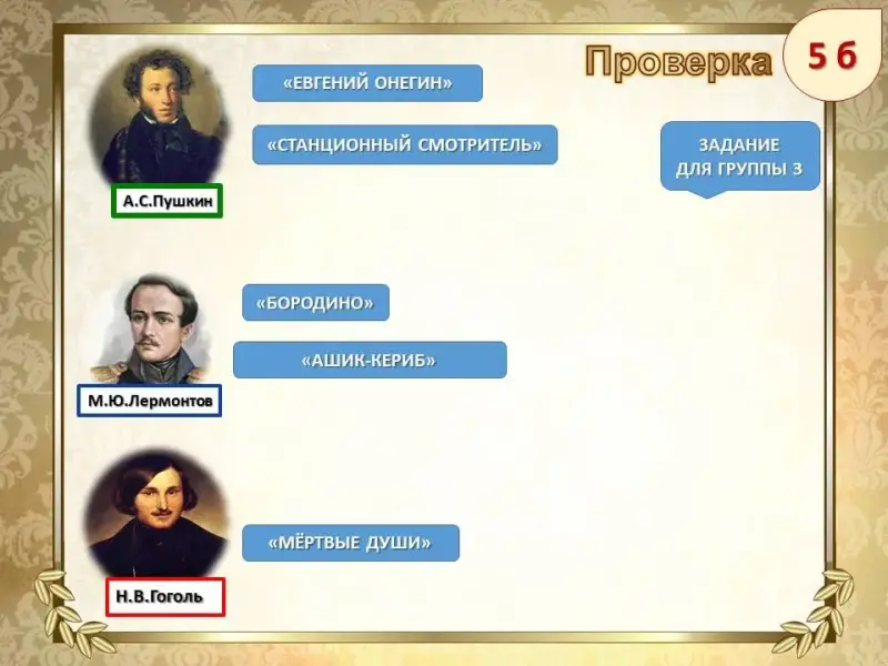 У интерактивной доски задание выполняет 1 из представителей команды (по 5 произведений), задание на соответствие произведений и авторов.