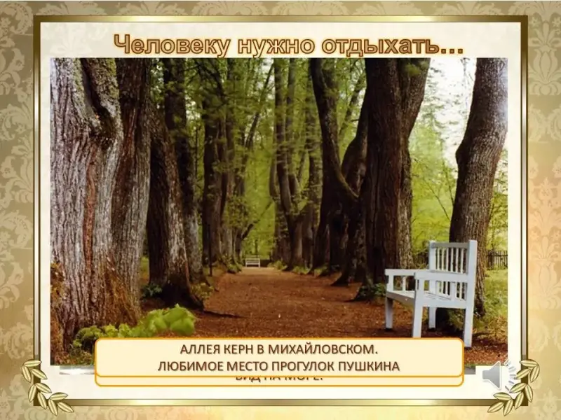 А.С.П.: Друзья мои, а как вы отдыхаете? Вот я люблю прогулки по тверскому бульвару в Москве, в Крыму есть замечательная оливковая роща. Люблю смотреть на море. Но любимое место - это аллея в Михайловском.