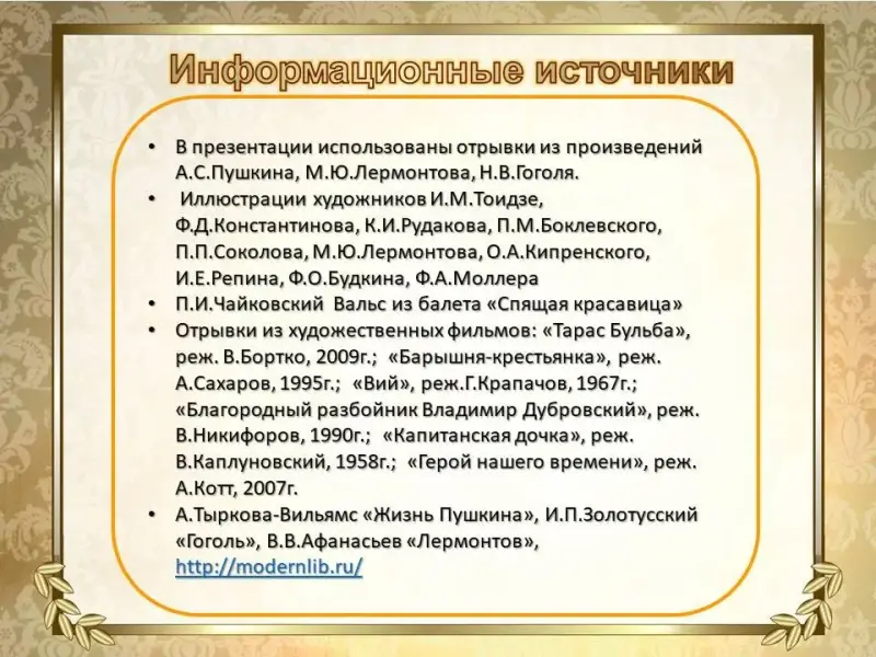 - В презентации использованы отрывки из произведений А.С.Пушкина, М.Ю.Лермонтова, Н.В.Гоголя.
