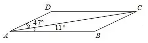 1. В параллелограмме ABCD проведена диагональ AC. Угол DAC равен 47°, а угол CAB равен 11°. Найдите больший угол параллелограмма ABCD. Ответ дайте в градусах.