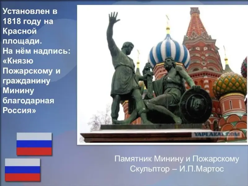 На слайде вы видите изображение памятника, работу скульптора Ивана Петровича Мартоса, изготовленную в 1818 г. Стоит этот памятник в Москве, на Красной площади рядом с Покровским собором (храмом Василия Блаженного). На постаменте возвышаются фигуры двух людей: нижегородского земского старосты Кузьмы Минина и воеводы князя Дмитрия Пожарского. На постаменте из красного гранита можно увидеть высеченную бронзовыми буквами надпись: "Гражданину Минину и князю Пожарскому благодарная Россия".