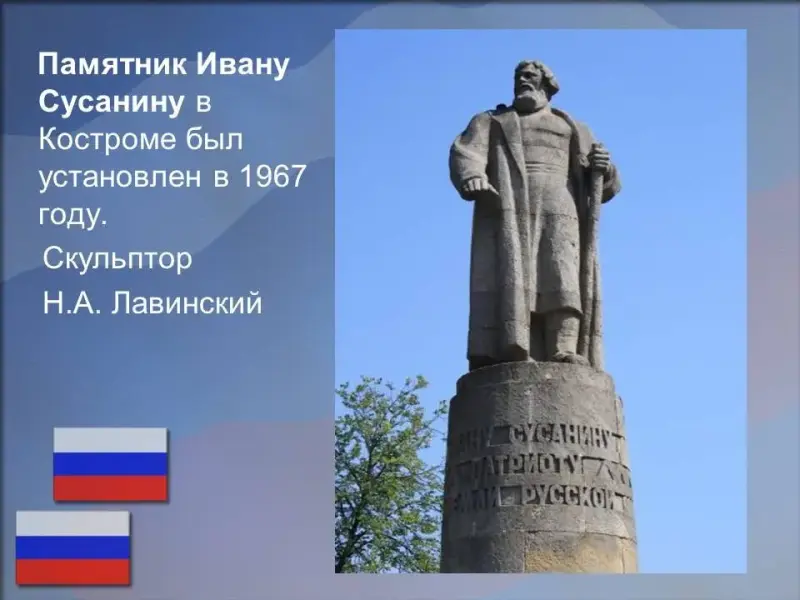 Иван Сусанин - русский национальный герой, крестьянин из Костромского уезда. О жизни Ивана Сусанина не известно в точности почти ничего. Существует и такое мнение, что Иван Сусанин был вотчинным старостой.