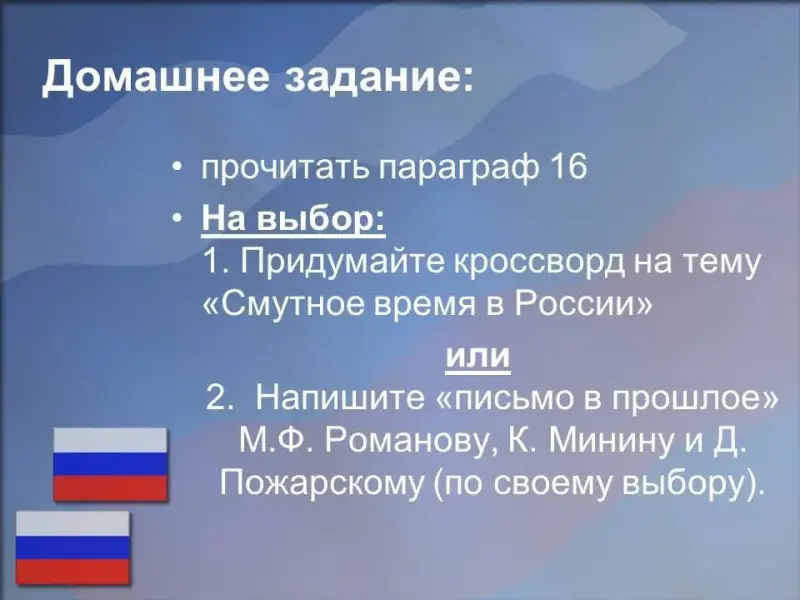 2. Напишите «письмо в прошлое» М.Ф. Романову, К. Минину и Д. Пожарскому, (по своему выбору).