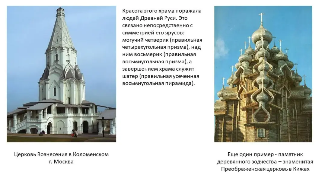 Церковь Вознесения в Коломенском. Красота этого храма поражала людей Древней Руси. Это связано непосредственно с симметрией его ярусов: могучий четверик (правильная четырехугольная призма), над ним восьмерик (правильная восьмиугольная призма), а завершением храма служит шатер (правильная усеченная восьмиугольная пирамида)