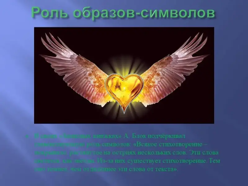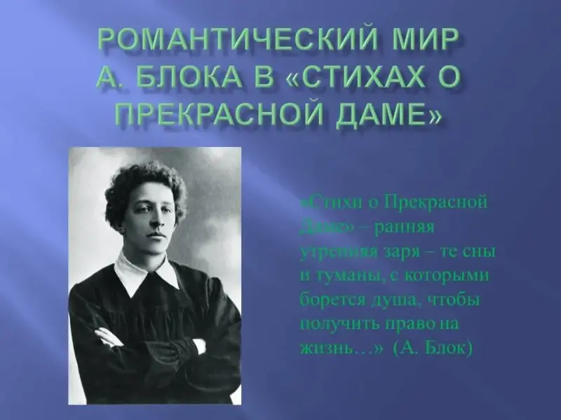 Учитель. Символический уровень образа Прекрасной Дамы свидетельствует о том, что в создании образа огромную роль играют символы. В своих «Записных книжках» Блок подчёркивал
