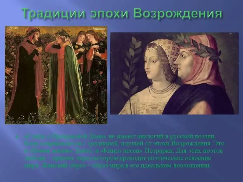«Стихи о Прекрасной Даме» не имеют аналогий в русской поэзии. Блок соприкасается с традицией, идущей от эпохи Возрождения. Это и «Новая жизнь» Данте, и «Книга песен» Петрарки. Для всех этих поэтов любовь являлась призмой, сквозь которую проходило поэтическое освоение мира. А женский образ - это образ мира в его идеальном воплощении.