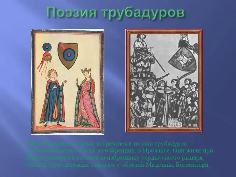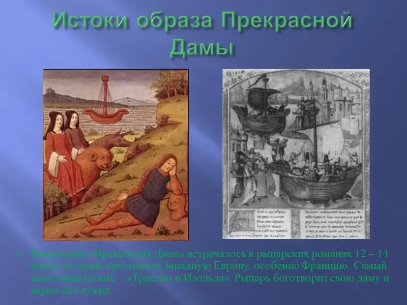 Если говорить об истории выражения «Прекрасная Дама», то оно фигурировало в рыцарских романах 12-14 веков, которые заполонили Западную Европу, особенно Францию. Самый известный из них - «Тристан и Изольда». Рыцарь боготворит свою даму и верно ей служит. Образ Прекрасной дамы встречался в поэзии трубадуров - средневековых поэтов на юге Франции, в Провансе. Они жили при дворах рыцарей и воспевали избранницу сердца своего рыцаря. Уже там земной образ прелестницы сливался с образом Мадонны, Богоматери.