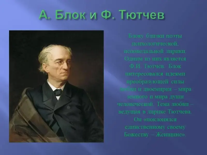 Очень близки Блоку поэты так называемой психологической, медитативной, исповедальной лирики: Фёдор Тютчев, Яков Полонский и Афанасий Фет. Блоку были созвучны идея преобразующей силы любви, идея двоемирия (мира земного и мира души человеческой).
