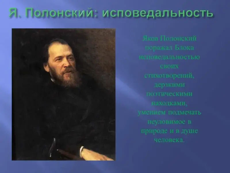 Яков Полонский поражал Блока исповедальностью своих стихотворений, дерзкими поэтическими находками, умением подмечать неуловимое в природе и в душе человека.