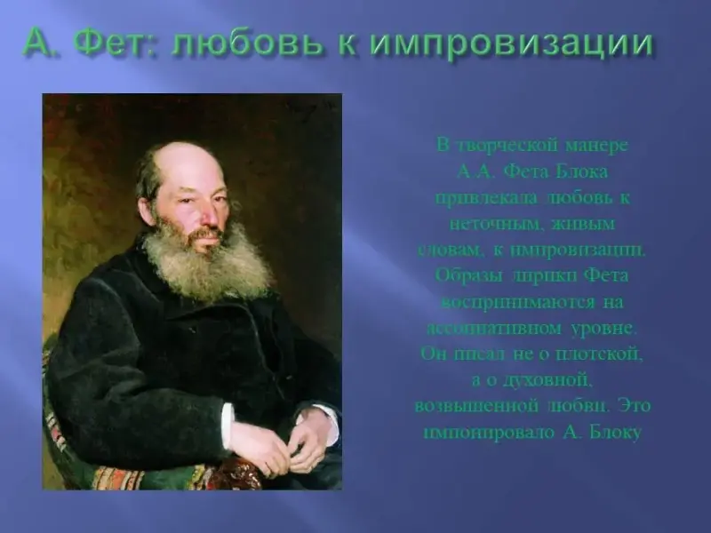 В творческой манере А.А.Фета Блока привлекала любовь поэта к неточным, живым словам, к импровизации. Творческую манеру Фета называют импрессионистской, образы его лирики воспринимаются на ассоциативном уровне. Он писал не о плотской, а о духовной, возвышенной любви. Это импонировало Блоку.