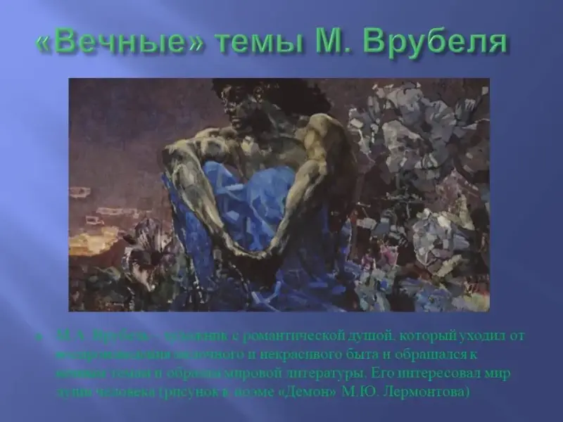 Влияние личности и творчества художника Михаила Александровича Врубеля на мироощущение А.А.Блока. Это художник с романтической душой, который уходил от воспроизведения мелочного и некрасивого быта и обращался к вечным темам и образам мировой литературы. Его интересовал прежде всего мир души человека (рисунки к поэме М.Ю.Лермонтова «Демон»: «Тамара в гробу», «Скачущий всадник»; рисунки к восточной повести «Измаил-Бей: «Прощание Зары с Измаилом», «Гамлет и Офелия»; пейзаж «К ночи»)