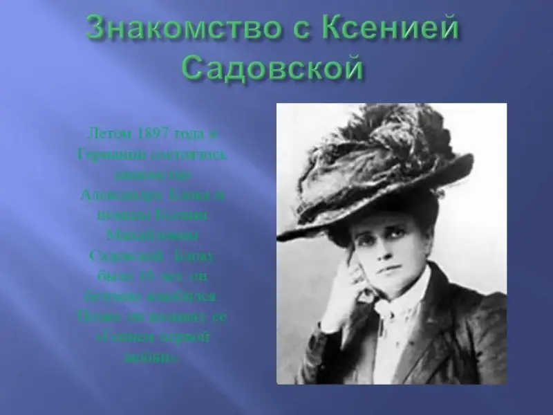 Летом 1897 года в Германии состоялось знакомство Александра Блока и певицы Ксении Михайловны Садовской. Блоку было 16 лет, он безумно влюбился в Садовскую. Позже он называл её «гением первой любви». Мотивы этого первого чувственного опыта проникают и в ранние стихотворения поэта.