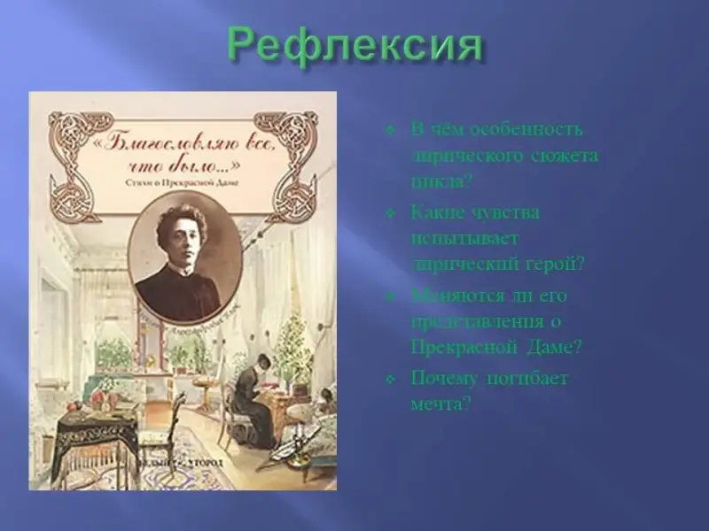 - Учитель. Тема Прекрасной Дамы постепенно исчерпывается в лирике А.А.Блока. Это определённый этап в процессе поиска поэтом своего жизненного и поэтического идеала, это шаг навстречу реальной жизни. Об этом свидетельствует II эпиграф урока - слова самого А.А.Блока о цикле.