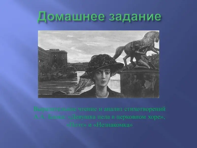 Подготовить выразительное чтение и анализ стихотворений А.А. Блока: «Девушка пела в церковном хоре», «Поэт», «Незнакомка».