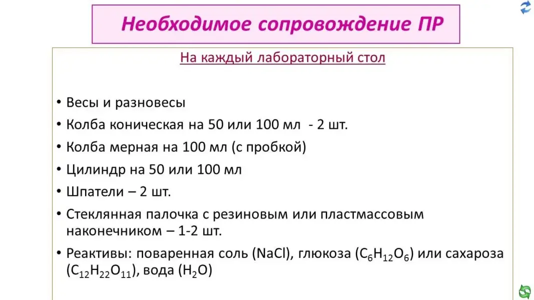 - Подготовить учащихся к выполнению практической работы «Вода. Растворы» (необходимо обсудить ход ее работы, ознакомить учащихся с методикой выполнения практической части работы, изучить вопросы техники безопасности в работе, познакомить учащихся с требованиями по оформлению практической работы)