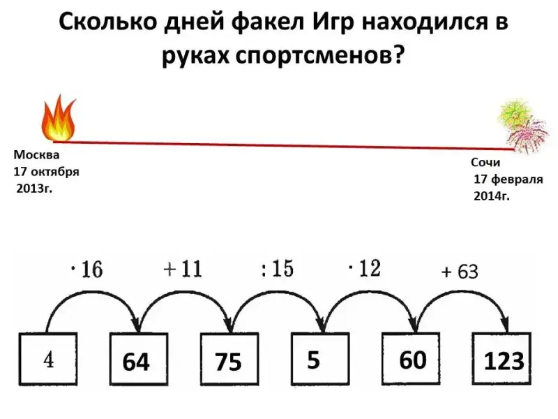 Сколько дней факел Игр находился в руках спортсменов? Решим пример и узнаем.
