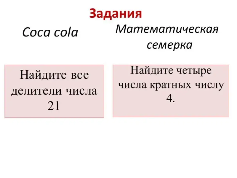 Задание команде «Coca cola»: Найдите все делители числа 21.