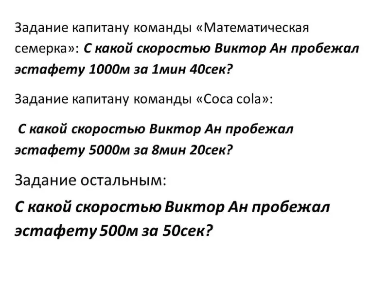 Задание капитану команды «Математическая семерка»: С какой скоростью Виктор Ан пробежал эстафету 1000м за 1мин 40сек?