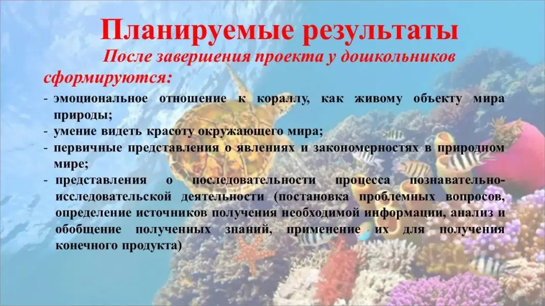 Цель проекта: Формирование у детей дошкольного возраста осознанно правильного отношения к явлениям, объектам живой и неживой природы на примере конкретного объекта - коралла.