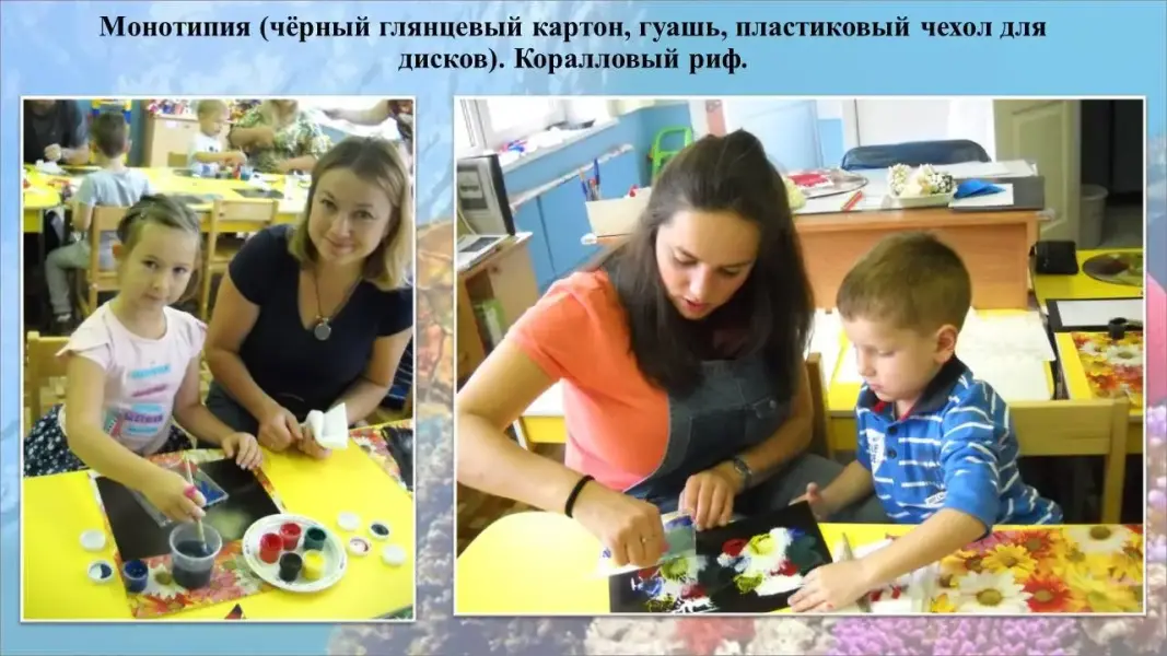 На втором этапе мастер-класса мы предложили для изображения подводного мира использовать другой приём - монотипию (на крышки от дисков наносили гуашью разноцветные пятна; делали оттиск на глянцевый картон, хорошенько прижимали, аккуратно, за ушки, поднимали крышку (сначала верхнюю часть, затем нижнюю); наклеивали морских обитателей; работы готовы).
