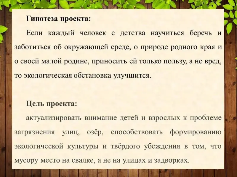 Гипотеза проекта. Мы предполагаем, если каждый человек с детства научиться беречь и заботиться об окружающей среде, о природе родного края и о своей малой родине, приносить ей только пользу, а не вред, то экологическая обстановка улучшится.