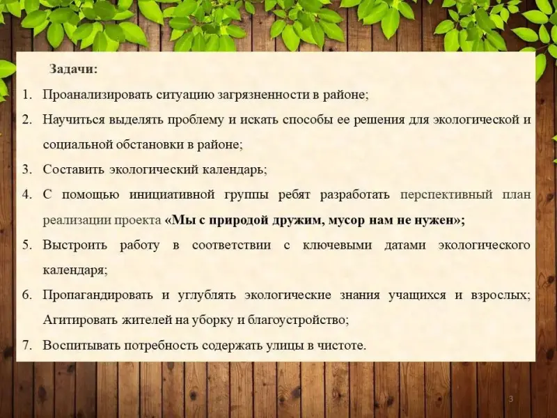 • Пропагандировать и углублять экологические знания учащихся и взрослых; Агитировать жителей на уборку и благоустройство;