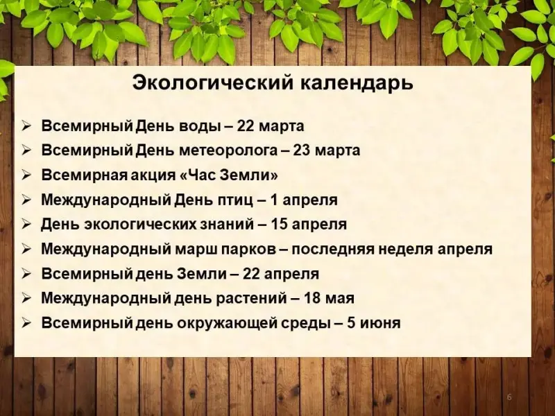 • Выстроить работу в соответствии с ключевыми датами экологического календаря;