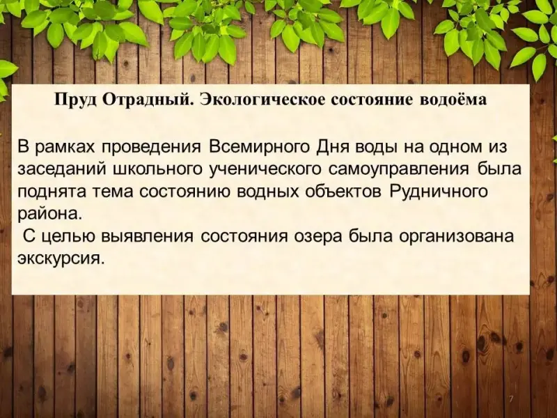 В рамках проведения Всемирного Дня воды на одном из заседаний школьного ученического самоуправления была поднята тема состоянию водных объектов Рудничного района. Оксана Александровна познакомила нас с водоёмом, расположенном на границе Кировского и Рудничного района. Интересна история создания данного пруда: оказывается, дедушка Оксаны Александровны, участвовал в раскопках котлована для этого озера и запускал первую рыбу в чистый водоём.