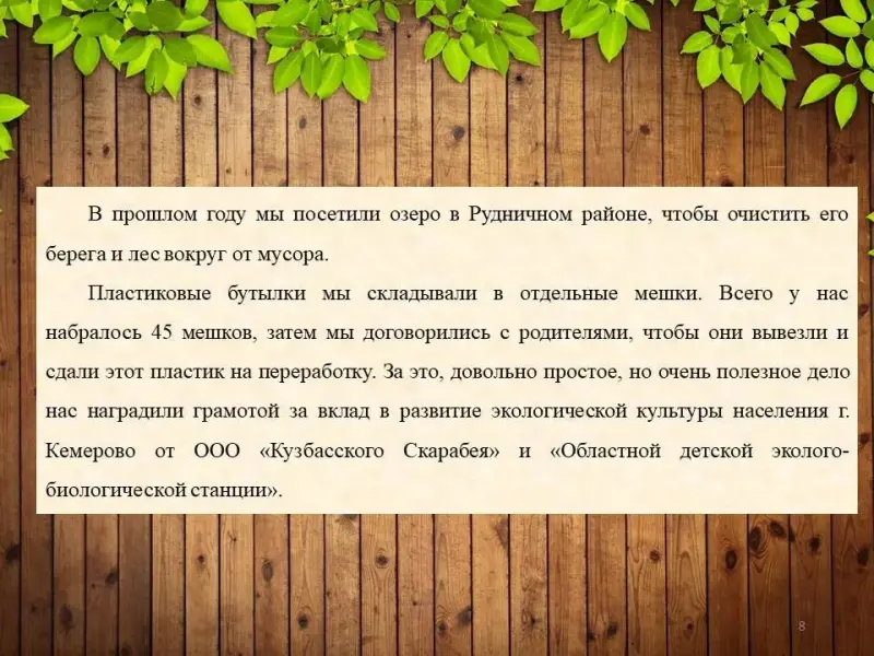 В прошлом году мы посетили озеро в Рудничном районе, чтобы очистить его берега и лес вокруг от мусора [см. приложение 2].