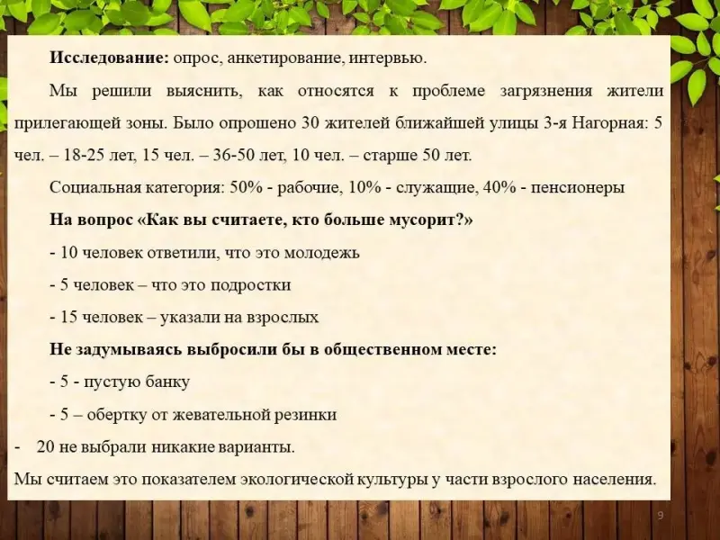 • Опрос среди сверстников с целью выявления их отношения к проблеме загрязнения района и готовности принять посильное участие по практическому выполнению проекта.