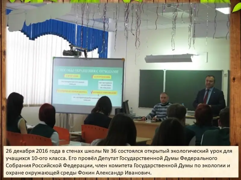 26 декабря 2016 года в стенах школы № 36 состоялся открытый экологический урок для учащихся 10-ого класса. Его провёл Депутат Государственной Думы Федерального Собрания Российской Федерации, член комитета Государственной Думы по экологии и охране окружающей среды Фокин Александр Иванович. Урок проходил в атмосфере диалога и общения с учащимися по теме экологических проблем загрязнения окружающей среды. Александр Иванович поведал ученикам о существующих в мире проблемах по утилизации мусора, продемонстрировал слайды о мусорных островах в Тихом океане, о проблемах переработке и сортировке отходов [см. приложение 11].