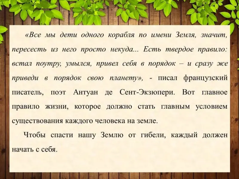 «Все мы дети одного корабля по имени Земля, значит, пересесть из него просто некуда... Есть твердое правило: встал поутру, умылся, привел себя в порядок - и сразу же приведи в порядок свою планету», - писал французский писатель, поэт Антуан де Сент-Экзюпери. Вот главное правило жизни, которое должно стать главным условием существования каждого человека на земле.