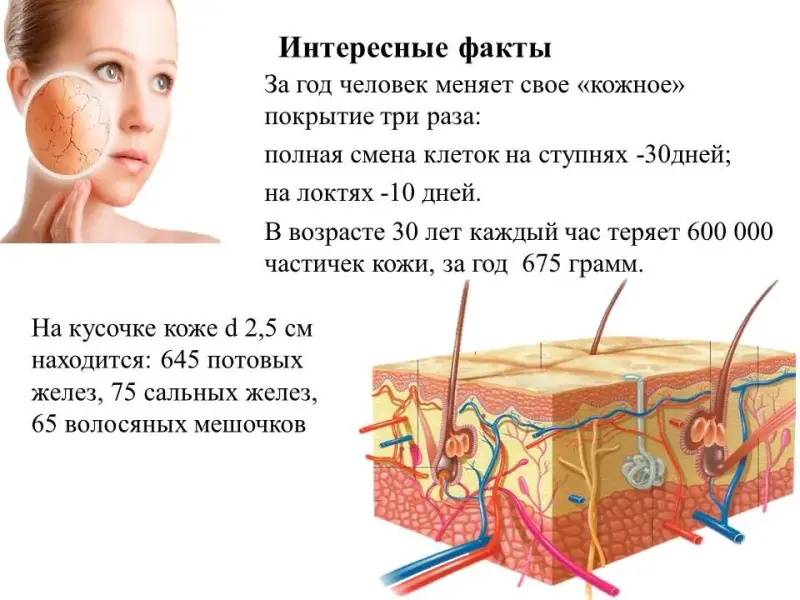 воды - почти 8 литров! Ежедневно через нее мы теряем почти 2 литра жидкости. А за год человек целиком меняет свое «кожаное» покрытие три раза. Теряя мертвые частички кожи, мы заменяем их новыми
