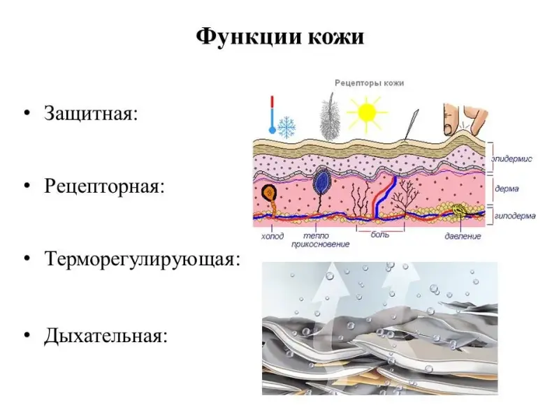 Рецепторная: в коже находятся нервные окончания, благодаря им мы чувствуем холод и тепло, давление, боль и т.д.