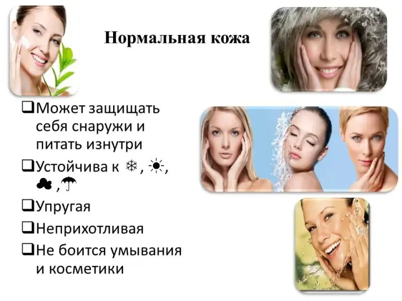 Кожа средней толщины, с малозаметными порами, сальные железы которой работают настолько активно, чтобы обеспечить оптимальное смазывание поверхности кожи. Нормальная кожа хорошо переносит умывания, большинство косметических средств и вообще радует владельца своей неприхотливостью.