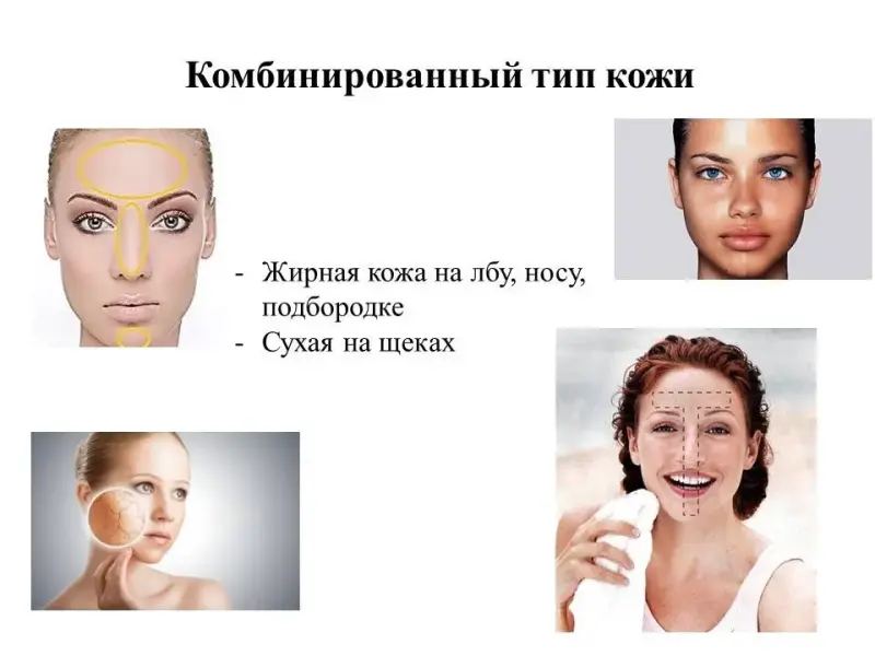 Сочетание разных типов кожи. Например, жирная кожа на лбу, носу и подбородке, а сухая - на щеках. Или пятна сухой кожи среди жирной или нормальной кожи. Или нормальные лоб и щеки, но лоснящийся нос.