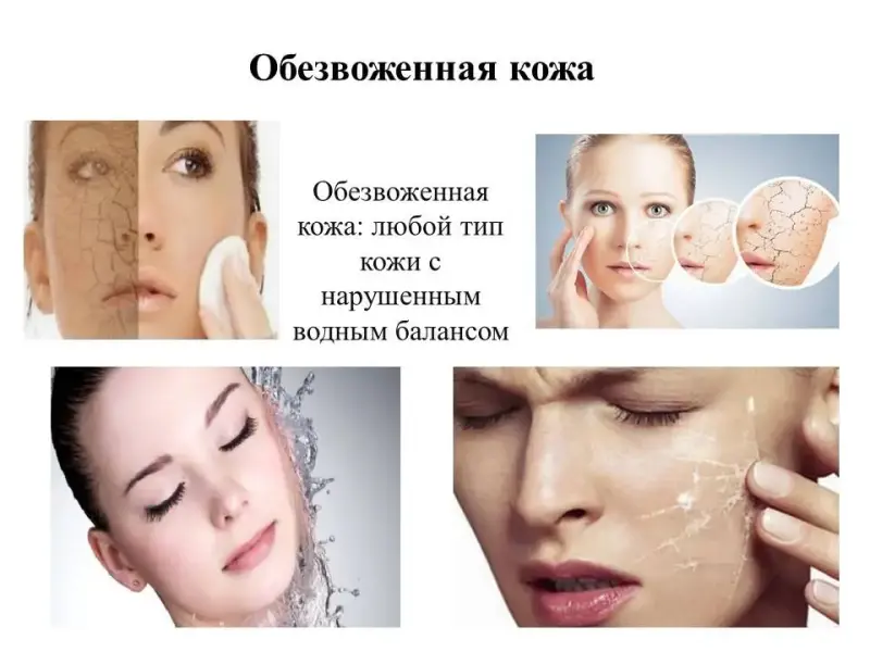 Обезвоженная кожа - любой тип кожи с нарушенным водным балансом. Признаками обезвоженности являются шелушение, повышенная чувствительность, вялый вид, шероховатость, появление сухих пятен на коже. Нужно учитывать также тот факт, что кожа с возрастом меняется. У 90% женщин, например, обнаруживается тенденция к сухости кожи.