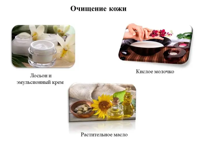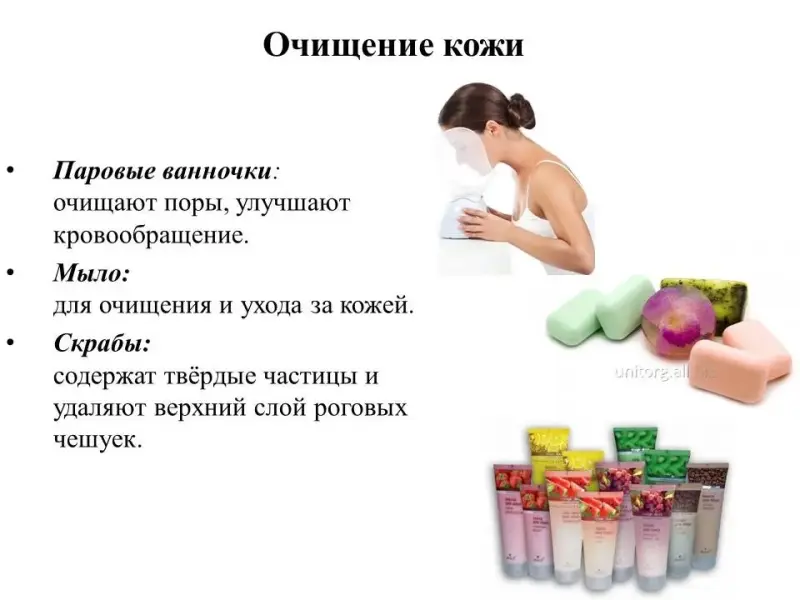 мыло, очищающие крема, очищающее масло, скрабы, отшелушивающие средства, пенки для умывания, лосьоны, тоники.